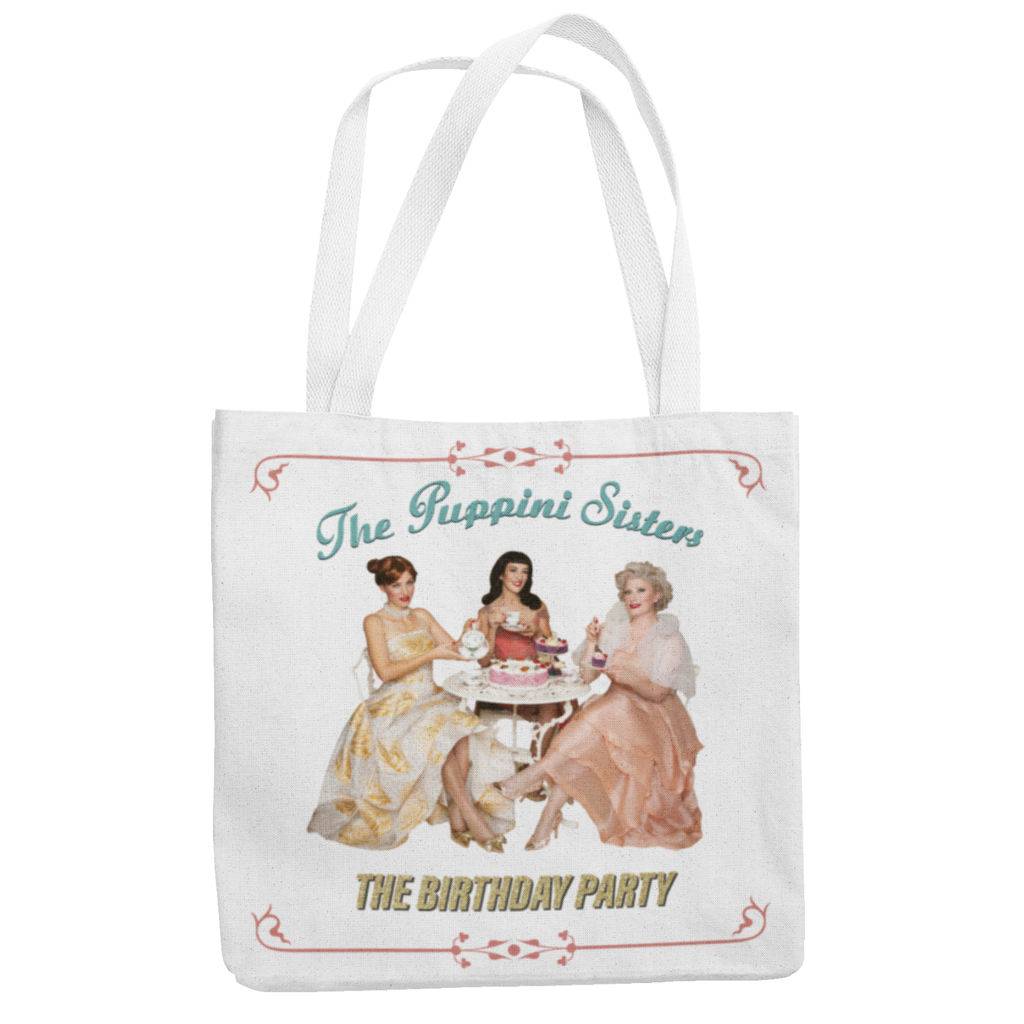 The Tea Table Edition captures The Puppini Sisters gathered around a dainty birthday spread, complete with vintage flourishes, soft pastel framing and The Birthday Party title in gleaming gold.